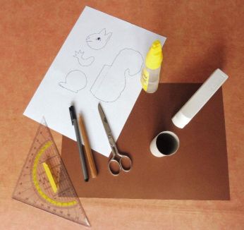 Übertrage die Vorlage auf das braune Papier. Achte darauf, dass Du jedes Teil zweimal brauchst. Schneide dann alle Teile aus. |